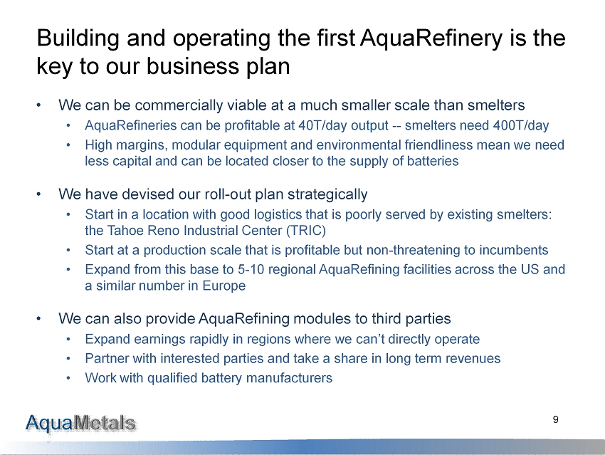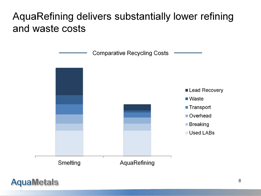8 Smelting AquaRefining Lead Recovery Waste Transport Overhead Breaking Used LABs AquaRefining delivers substantially lower refining and waste costs Comparative Recycling Costs