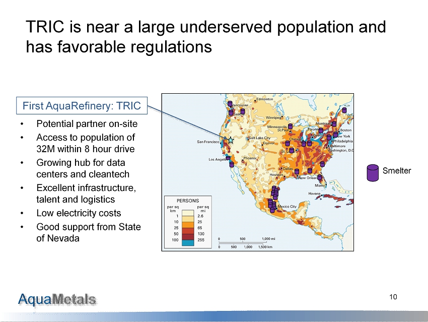 • We can be commercially viable at a much smaller scale than smelters • AquaRefineries can be profitable at 40T/day output -- smelters need 400T/ day • High margins, modular equipment and environmental friendliness mean we need less capital and can be located closer to the supply of batteries • We have devised our roll - out plan strategically • Start in a location with good logistics that is poorly served by existing smelters: the Tahoe Reno Industrial Center (TRIC) • Start at a production scale that is profitable but non - threatening to incumbents • Expand from this base to 5 - 10 regional AquaRefining facilities across the US and a similar number in Europe • We can also provide AquaRefining modules to third parties • Expand earnings rapidly in regions where we can’t directly operate • Partner with interested parties and take a share in long term revenues • Work with qualified battery manufacturers Building and operating the first AquaRefinery is the key to our business plan 9