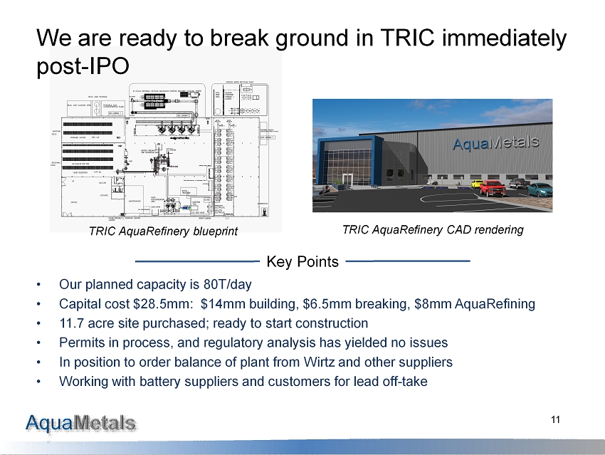 TRIC is near a large underserved population and has favorable regulations 10 Smelter First AquaRefinery : TRIC • Potential partner on - site • Access to population of 32M within 8 hour drive • Growing hub for data centers and cleantech • Excellent infrastructure, talent and logistics • Low electricity costs • Good support from State of Nevada
