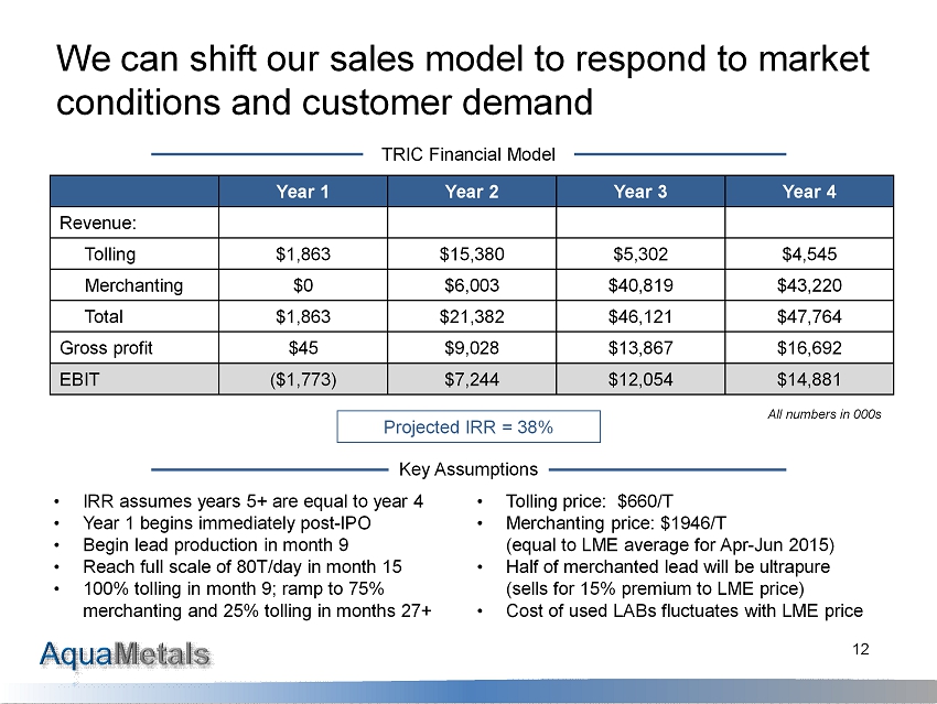 11 We are ready to break ground in TRIC immediately post - IPO TRIC AquaRefinery blueprint TRIC AquaRefinery CAD rendering Key Points • Our planned capacity is 80T/day • Capital cost $ 28.5mm: $14mm building, $6.5mm breaking, $8mm AquaRefining • 11.7 acre site purchased; ready to start construction • Permits in process, and regulatory analysis has yielded no issues • In position to order balance of plant from Wirtz and other suppliers • Working with battery suppliers and customers for lead off - take