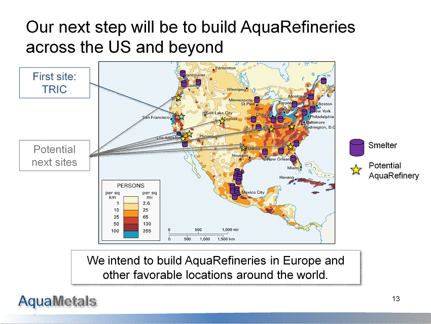 Our next step will be to build AquaRefineries across the US and beyond We intend to build AquaRefineries in Europe and other favorable locations around the world. First site: TRIC Potential next sites Smelter Potential AquaRefinery 13