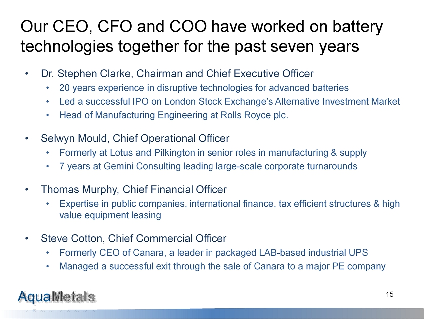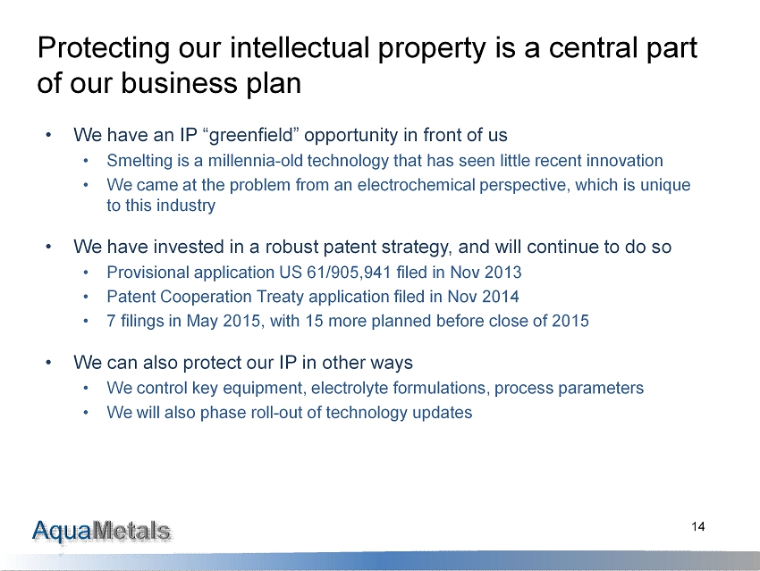 Protecting our intellectual property is a central part of our business plan • We have an IP “greenfield” opportunity in front of us • Smelting is a millennia - old technology that has seen little recent innovation • We came at the problem from an electrochemical perspective, which is unique to this industry • We have invested in a robust patent strategy, and will continue to do so • Provisional application US 61/905,941 filed in Nov 2013 • Patent Cooperation Treaty application filed in Nov 2014 • 7 filings in May 2015, with 15 more planned before close of 2015 • We can also protect our IP in other ways • We control key equipment, electrolyte formulations, process parameters • We will also phase roll - out of technology updates 14