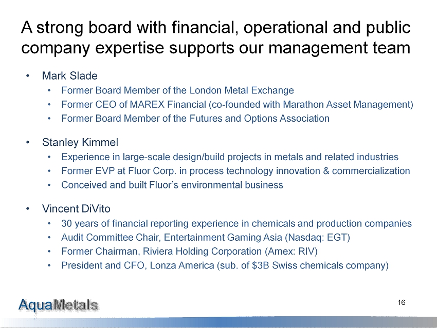 15 • Dr. Stephen Clarke, Chairman and Chief Executive Officer • 20 years experience in disruptive technologies for advanced batteries • Led a successful IPO on London Stock Exchange’s Alternative Investment Market • Head of Manufacturing Engineering at Rolls Royce plc. • Selwyn Mould , Chief Operational Officer • Formerly at Lotus and Pilkington in senior roles in manufacturing & supply • 7 years at Gemini Consulting leading large - scale corporate turnarounds • Thomas Murphy, Chief Financial Officer • Expertise in public companies, international finance , tax efficient structures & high value equipment leasing • Steve Cotton, Chief Commercial Officer • Formerly CEO of Canara , a leader in packaged LAB - based industrial UPS • Managed a successful exit through the sale of Canara to a major PE company Our CEO, CFO and COO have worked on battery technologies together for the past seven years