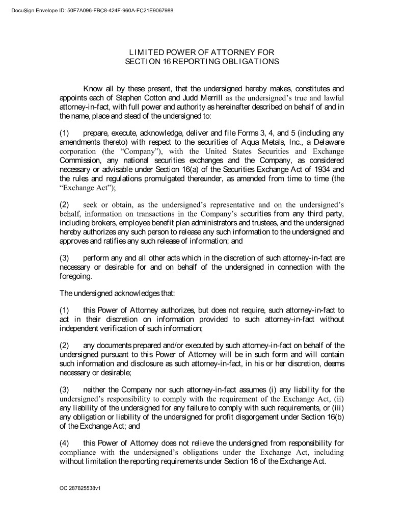 DocuSign Envelope ID: 50F7A096-FBC8-424F-960A-FC21E9067988 LIMITED POWER OF ATTORNEY FOR SECTION 16 REPORTING OBLIGATIONS Know all by these present, that the undersigned hereby makes, constitutes and appoints each of Stephen Cotton and Judd Merrill as the undersigned’s true and lawful attorney-in-fact, with full power and authority as hereinafter described on behalf of and in the name, place and stead of the undersigned to: (1) prepare, execute, acknowledge, deliver and file Forms 3, 4, and 5 (including any amendments thereto) with respect to the securities of Aqua Metals, Inc., a Delaware corporation (the “Company”), with the United States Securities and Exchange Commission, any national securities exchanges and the Company, as considered necessary or advisable under Section 16(a) of the Securities Exchange Act of 1934 and the rules and regulations promulgated thereunder, as amended from time to time (the “Exchange Act”); (2) seek or obtain, as the undersigned’s representative and on the undersigned’s behalf, information on transactions in the Company’s securities from any third party, including brokers, employee benefit plan administrators and trustees, and the undersigned hereby authorizes any such person to release any such information to the undersigned and approves and ratifies any such release of information; and (3) perform any and all other acts which in the discretion of such attorney-in-fact are necessary or desirable for and on behalf of the undersigned in connection with the foregoing. The undersigned acknowledges that: (1) this Power of Attorney authorizes, but does not require, such attorney-in-fact to act in their discretion on information provided to such attorney-in-fact without independent verification of such information; (2) any documents prepared and/or executed by such attorney-in-fact on behalf of the undersigned pursuant to this Power of Attorney will be in such form and will contain such information and disclosure as such attorney-in-fact, in his or her discretion, deems necessary or desirable; (3) neither the Company nor such attorney-in-fact assumes (i) any liability for the undersigned’s responsibility to comply with the requirement of the Exchange Act, (ii) any liability of the undersigned for any failure to comply with such requirements, or (iii) any obligation or liability of the undersigned for profit disgorgement under Section 16(b) of the Exchange Act; and (4) this Power of Attorney does not relieve the undersigned from responsibility for compliance with the undersigned’s obligations under the Exchange Act, including without limitation the reporting requirements under Section 16 of the Exchange Act. OC 287825538v1