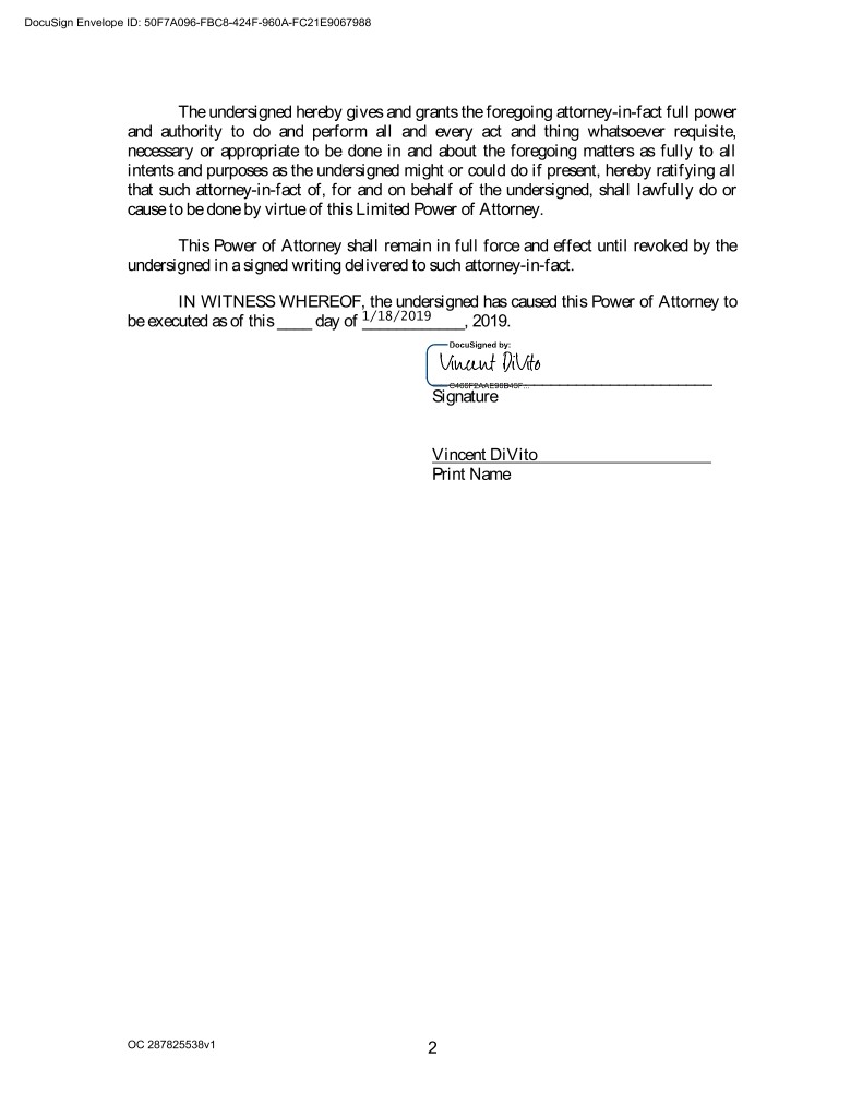 DocuSign Envelope ID: 50F7A096-FBC8-424F-960A-FC21E9067988 The undersigned hereby gives and grants the foregoing attorney-in-fact full power and authority to do and perform all and every act and thing whatsoever requisite, necessary or appropriate to be done in and about the foregoing matters as fully to all intents and purposes as the undersigned might or could do if present, hereby ratifying all that such attorney-in-fact of, for and on behalf of the undersigned, shall lawfully do or cause to be done by virtue of this Limited Power of Attorney. This Power of Attorney shall remain in full force and effect until revoked by the undersigned in a signed writing delivered to such attorney-in-fact. IN WITNESS WHEREOF, the undersigned has caused this Power of Attorney to be executed as of this ____ day of 1/18/2019____________, 2019. _________________________________ Signature Vincent DiVito Print Name OC 287825538v1 2